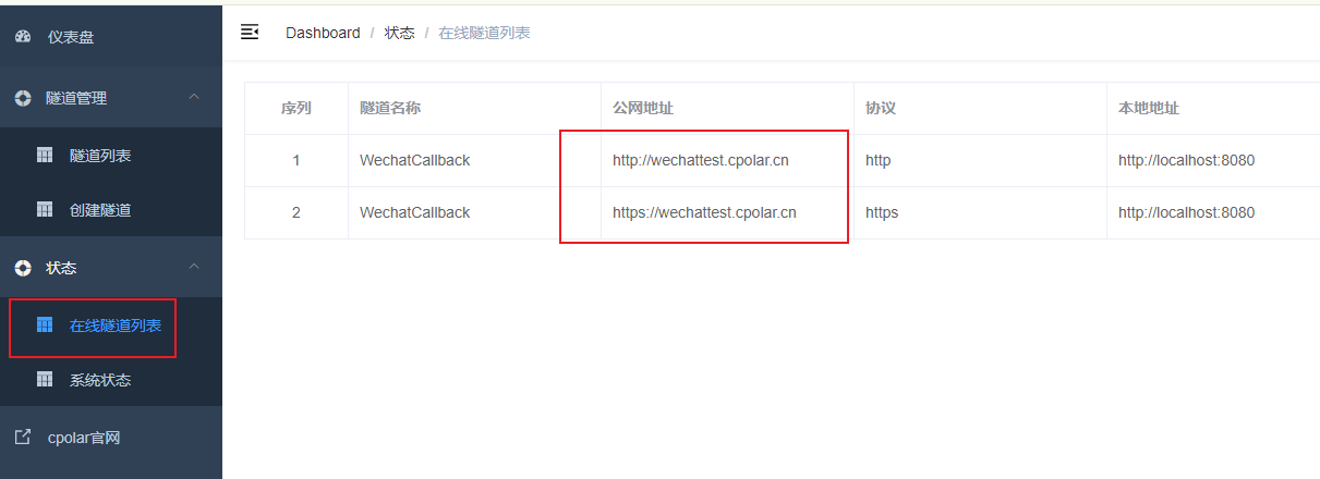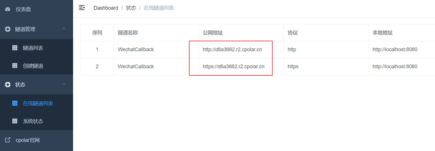 隧道创建成功后,点击左侧的状态——在线隧道列表,查看所生成的域名地址,有两种访问方式,一种是http 和https,域名我们需要记住,稍后在企业微信开发者中心创建应用的时候需要填写该域名!