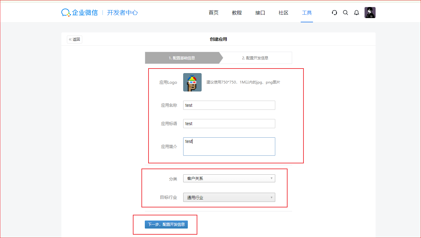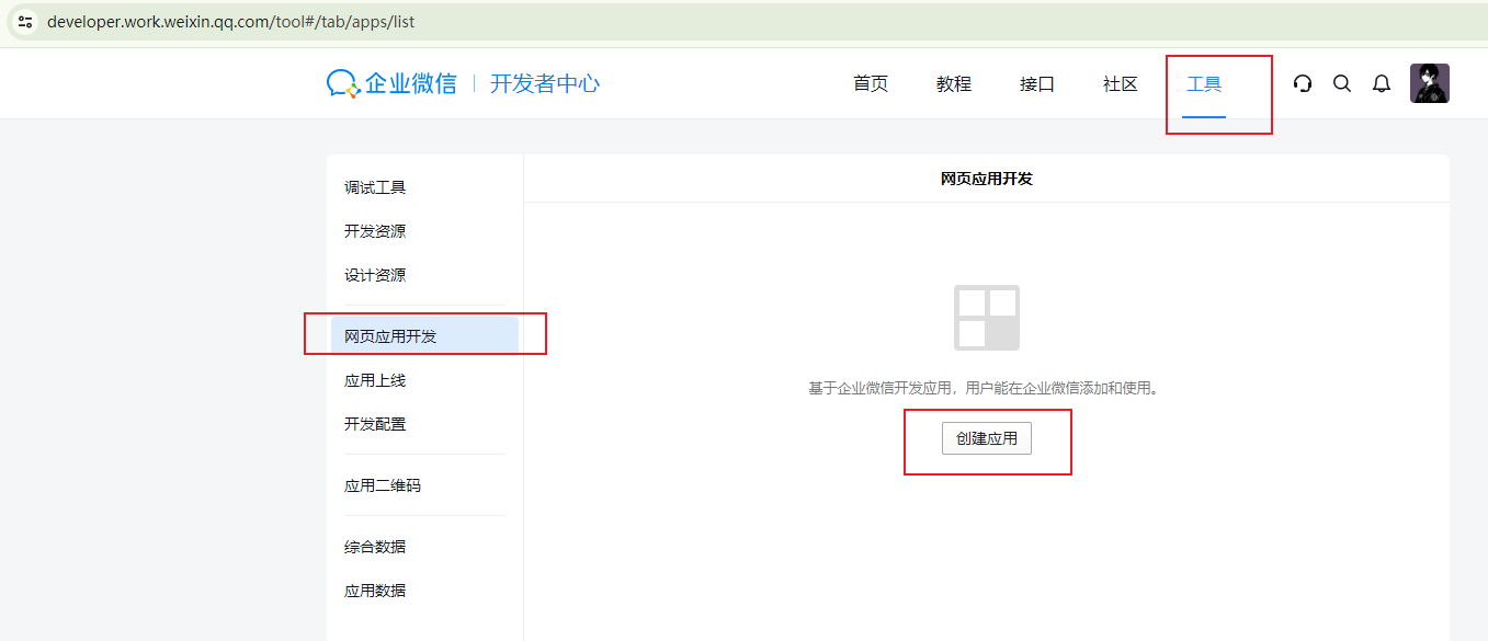 进入微信企业开发者中心,登录后,点击上方工具,再点击左侧网页应用开发,进入创建应用界面,点击创建应用