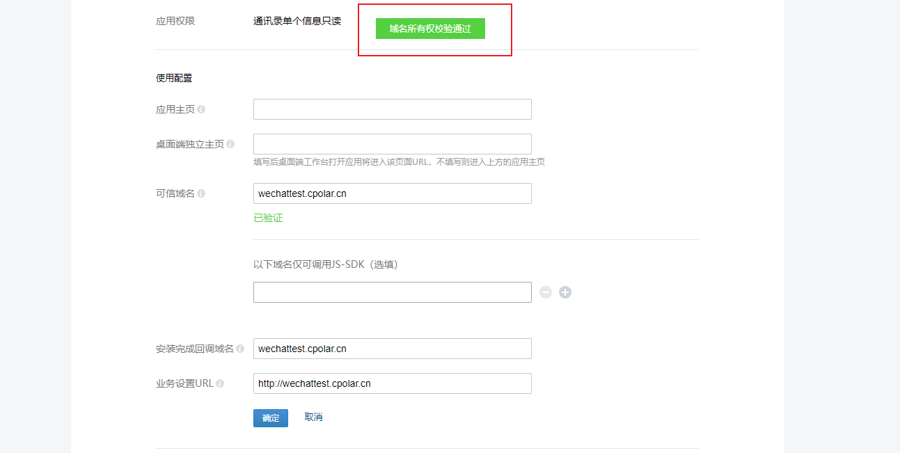 可以看到,全部校验成功了,无公网IP,无公网服务器,使用cpolar域名同样可以完成企业微信网页应用开发调试