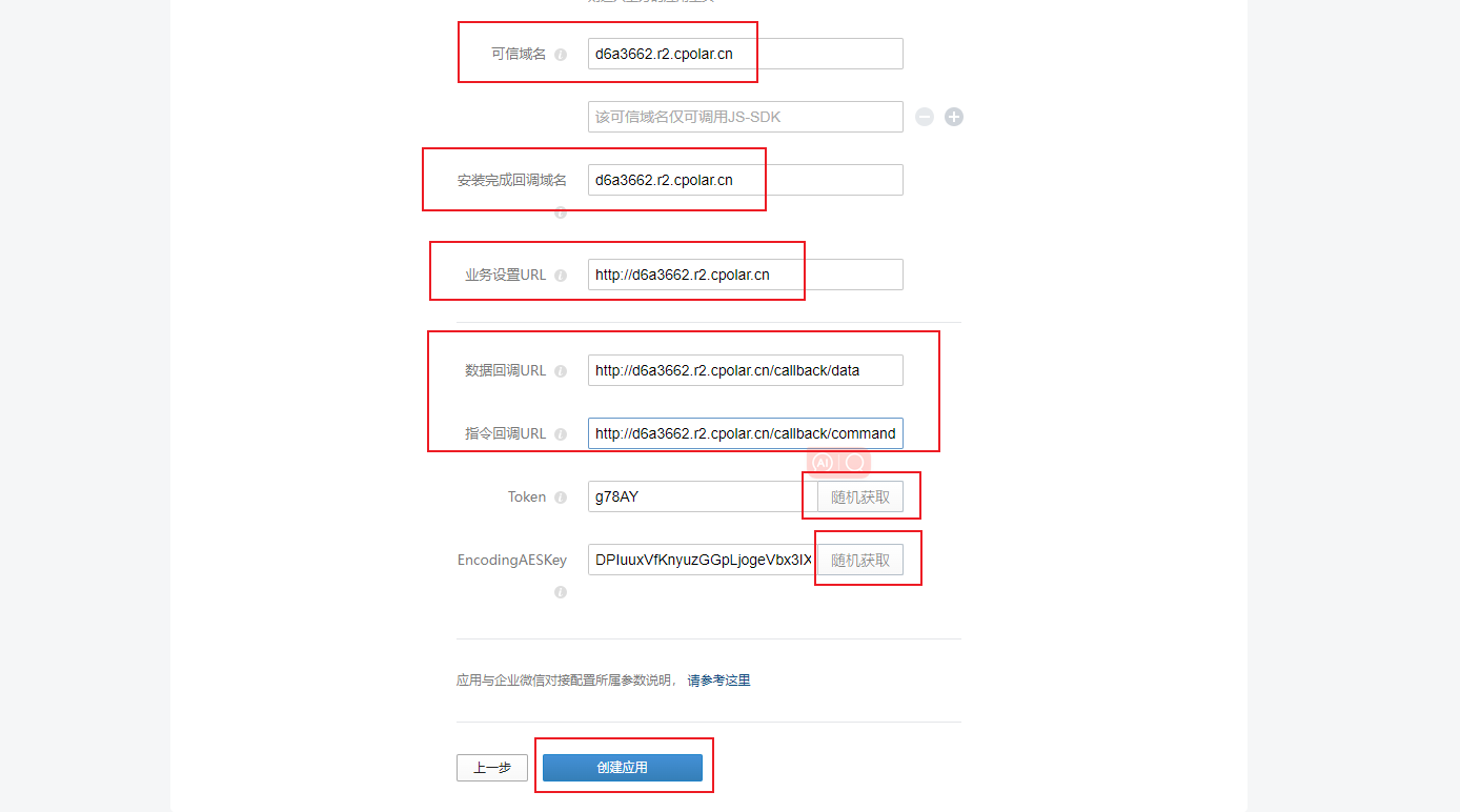把要求填写的域名信息填写上面我们在cpolar中创建的域名,然后点击创建应用