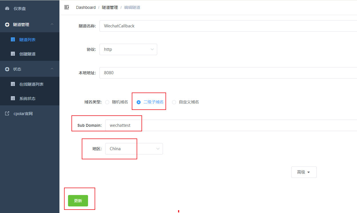 修改隧道信息,将保留成功的二级子域名配置到隧道中