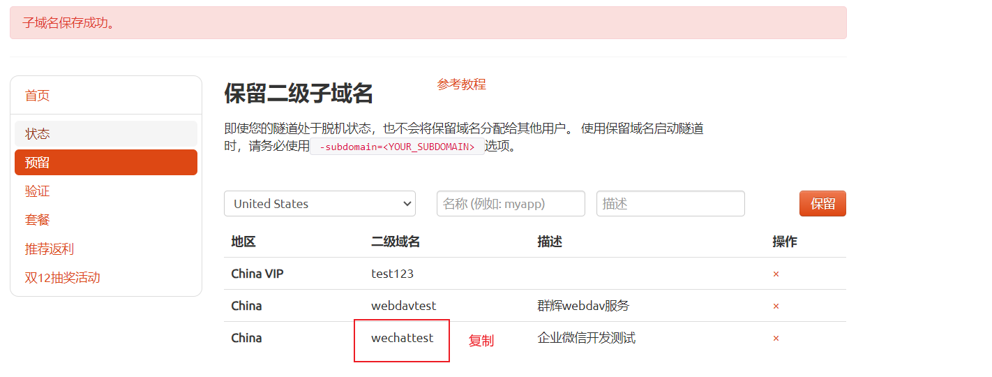 登录cpolar官网后台,点击左侧的预留,选择保留二级子域名,设置一个二级子域名名称,点击保留,保留成功后复制保留的二级子域名名称