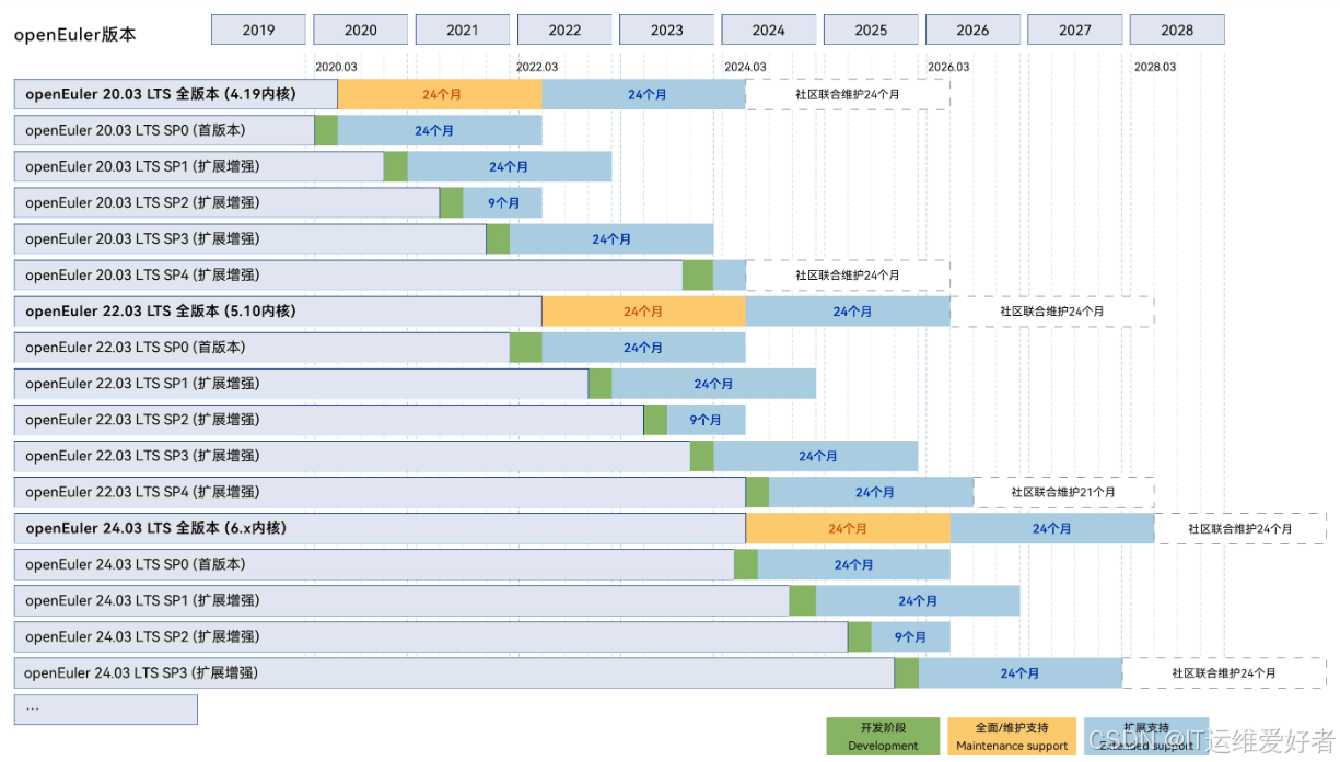 - LTS版本SP版本生命周期原则上按照小SP(6月份Release,可选) 9个月,大SP (12月份Release)24个月执行;大规模使用建议选择大SP。