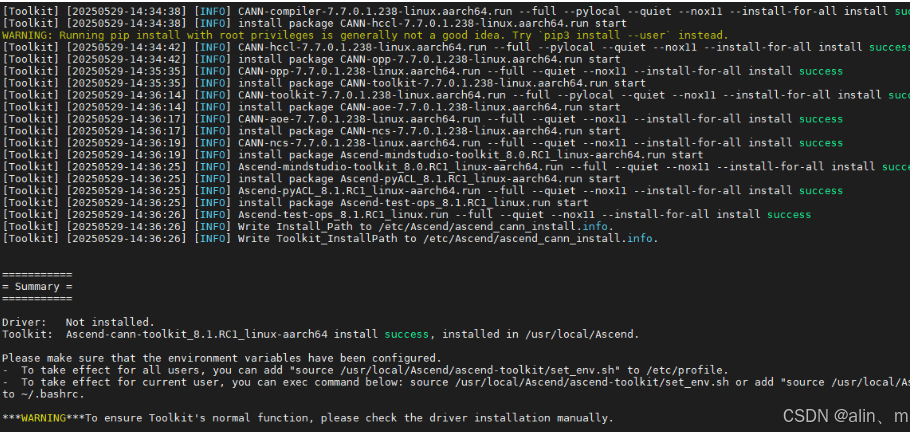 Ascend-cann-toolkit 8.1.Rcl linux-aarch64 install success