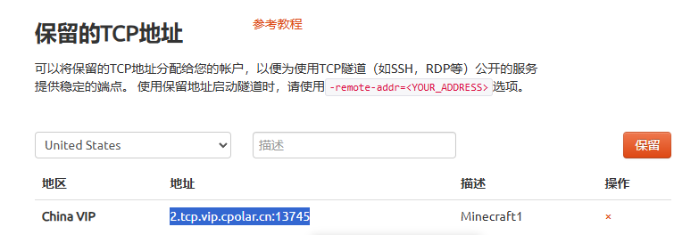 如果我们需要经常和小伙伴们联机游戏或者长时间游戏,由于刚才创建的是随机的地址,24小时会发生变化。如果不想每次联机游戏都重新创建一个公网TCP隧道,可以选择创建一个固定的tcp地址来解决这个问题。