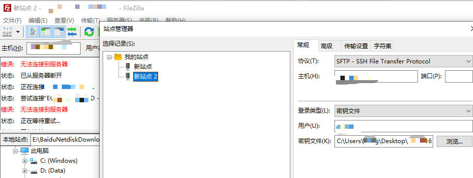 4. 在FileZilla的 **密钥文件** 处,选择这个新生成的 `.ppk` 文件即可。