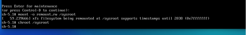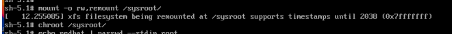 此时系统会显示root shell,磁盘的实际根文件系统会只读挂载到/sysroot,需要将根文件系统更改为读写模式;
