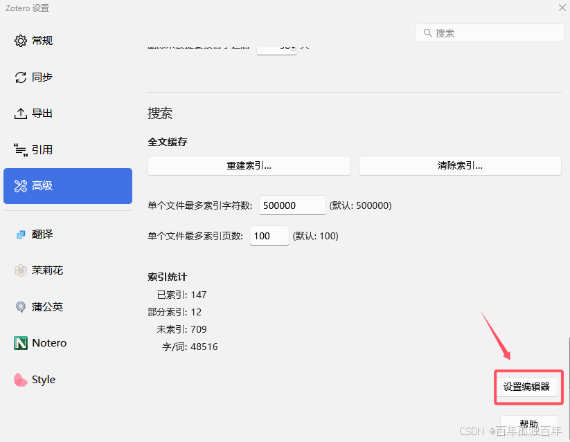 zotero中点击 编辑–>高级,然后在高级中往下翻,翻到末尾,找到设置编辑器,如下: