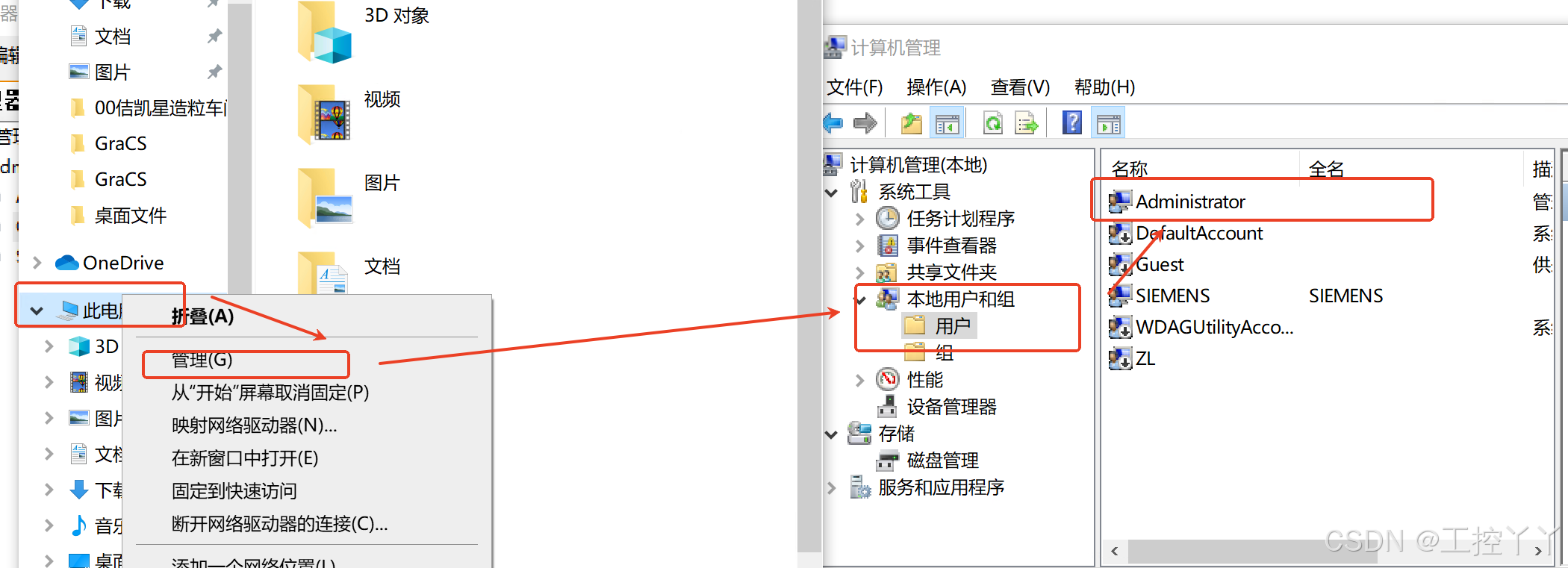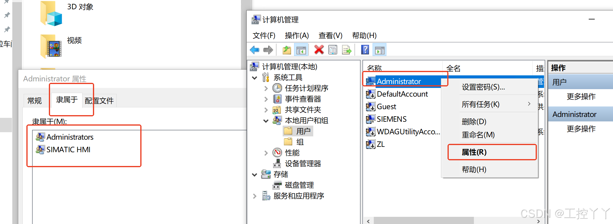2.打开用户,最方便的就是都用administrator用户来连接,就是服务器与客户端的密码和用户名都得相同,且客户端和服务器得同一个账户得权限都得相同,即隶属于administrators,和simatic HMI这两个类型。