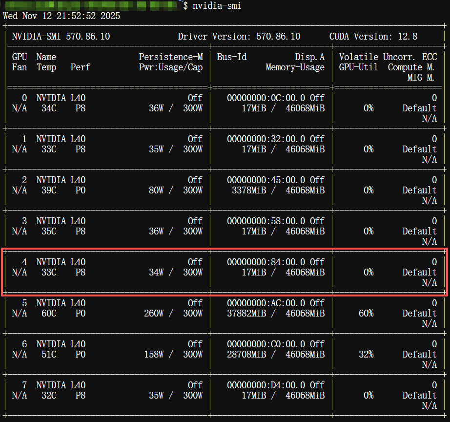 [三 11月 12 21:40:48 2025] NVRM: GPU 0000:84:00.0: rm_init_adapter failed, device minor number 4
