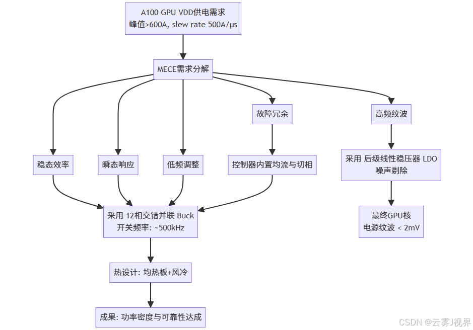 [步骤一:MECE架构分解] 设计团队首先运用 MECE原则 拆解供电需求。VDD供电被“相互独立,完全穷尽”地分解为:稳态高效率区、瞬态大电流响应、高频纹波抑制、低频负载调整、故障隔离与均流 五个子问题。