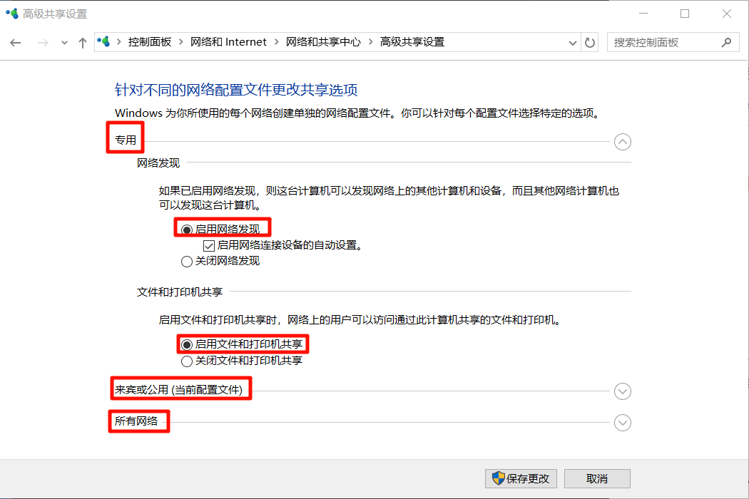 (3)打开其中“专用”和“来宾或公用”的“启用网络发现”和“启用文件和打印机共享”;打开其中“所有网络”的“公用文件夹共享”。