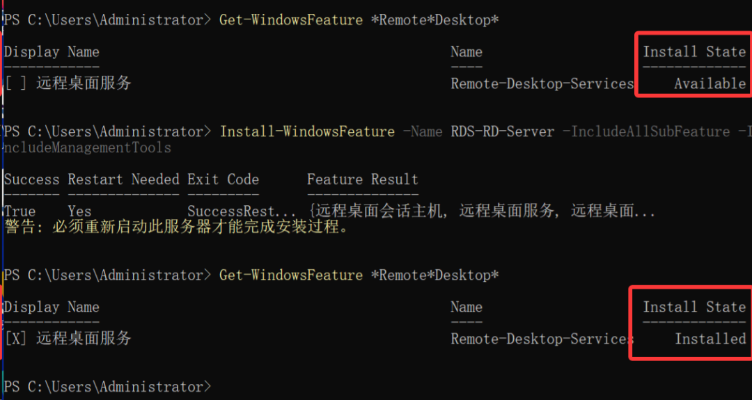 看到远程桌面服务状态变成Installed就表示安装成功了。不过,必需重启服务器才能完成安装过程,那就重启一下。