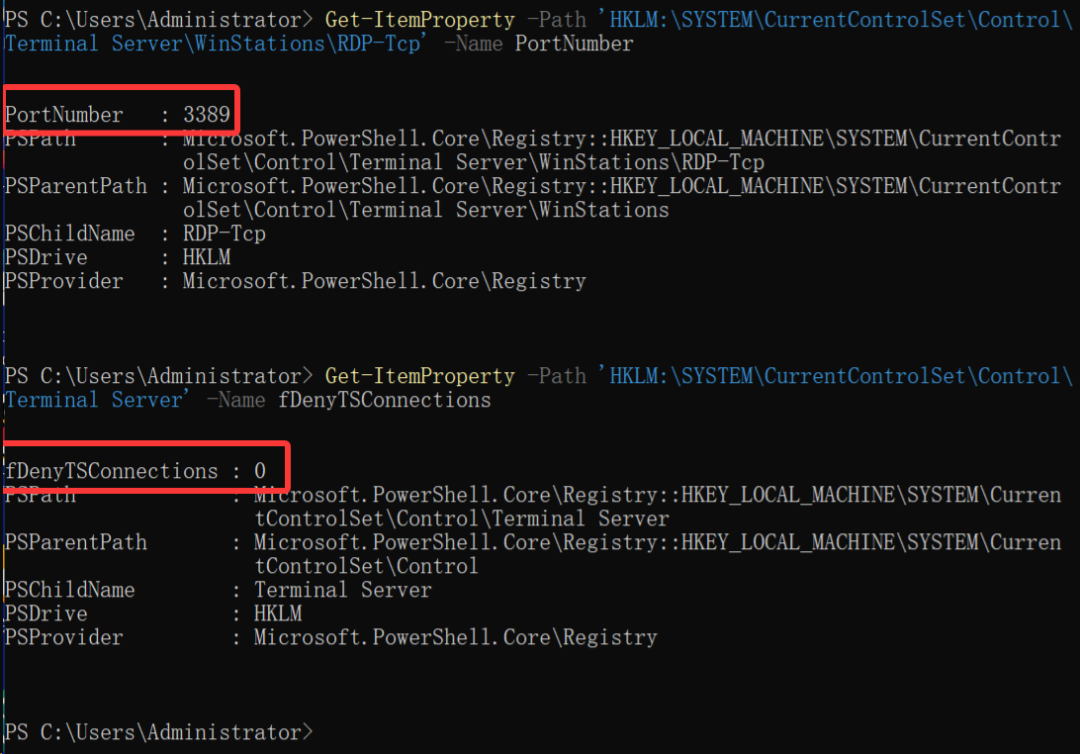 奇怪了,端口号还是默认的3389,fDenyTSConnections=0也表示远程桌面确实处于启用状态。