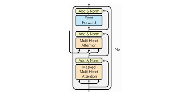 - 解码器部分: * 由N个解码器层堆叠而成 * 每个解码器层由三个子层连接结构组成 * 第一个子层连接结构包括一个多头自注意力子层和规范化层以及一个残差连接 * 第二个子层连接结构包括一个多头注意力子层和规范化层以及一个残差连接 * 第三个子层连接结构包括一个前馈全连接子层和规范化层以及一个残差连接