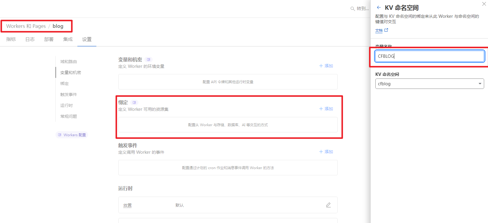 在新建的 Workers 中绑定新建的 KV,名称必须为 CFBLOG