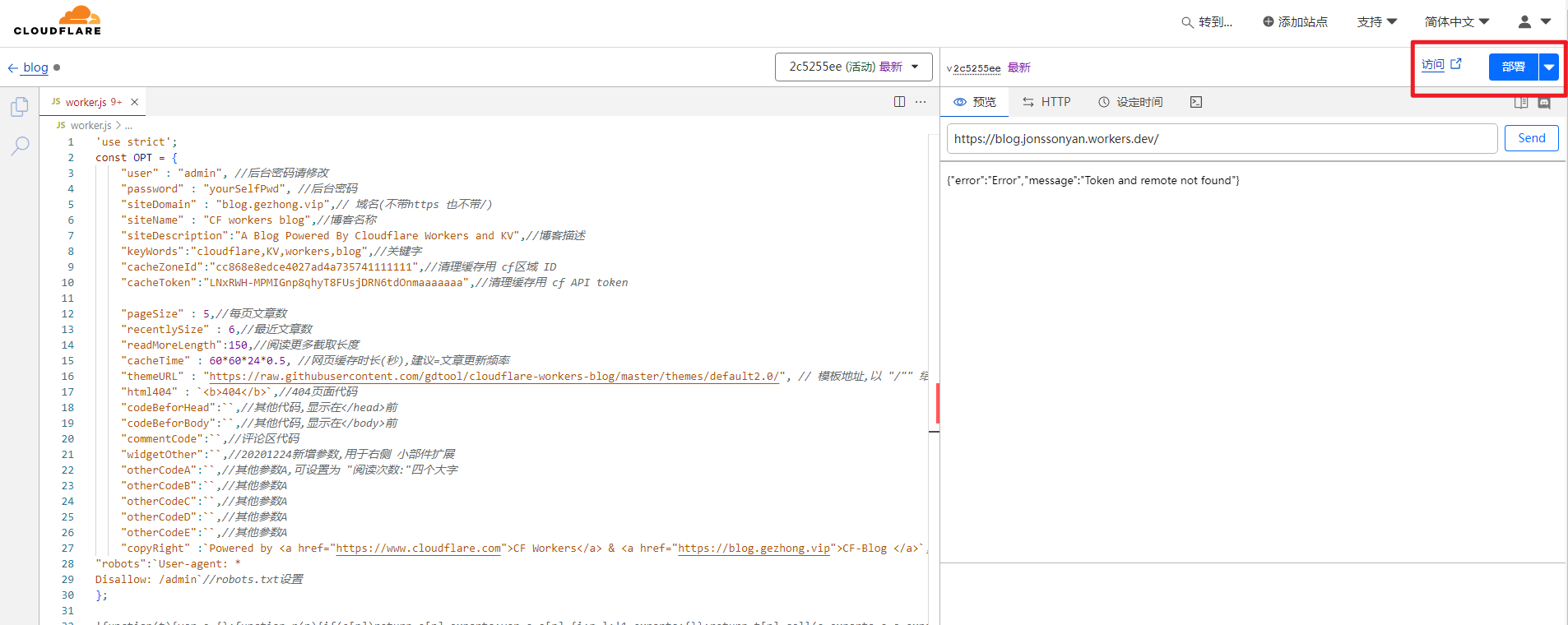 在 Workers 中 编辑代码,将以下 index.js 文件中的内容复制保存并部署,注意 index.js 中有一些配置,根据自己的实际情况更改,比如后台账号和密码,主题,域名等等