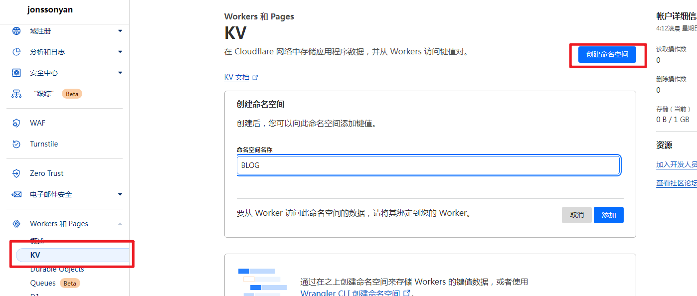点击 “Workers 和 Pages” -> “KV”,新建 KV