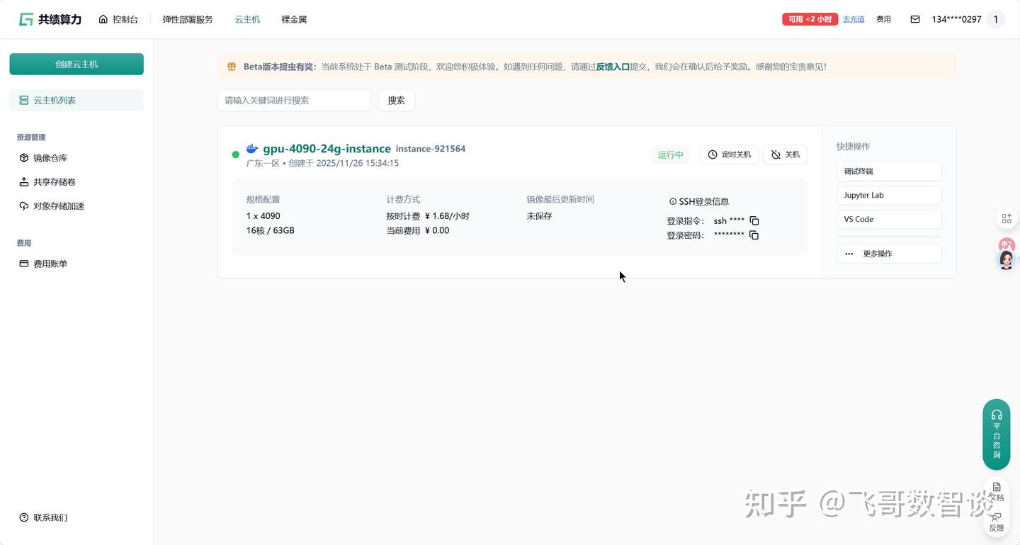 最近我使用的算力平台是“共绩算力”,RTX 4090 只要 1.68 元/小时,还能按毫秒计费、自动扩容,非常便于我根据研究的模型挑选合适的节点配置。