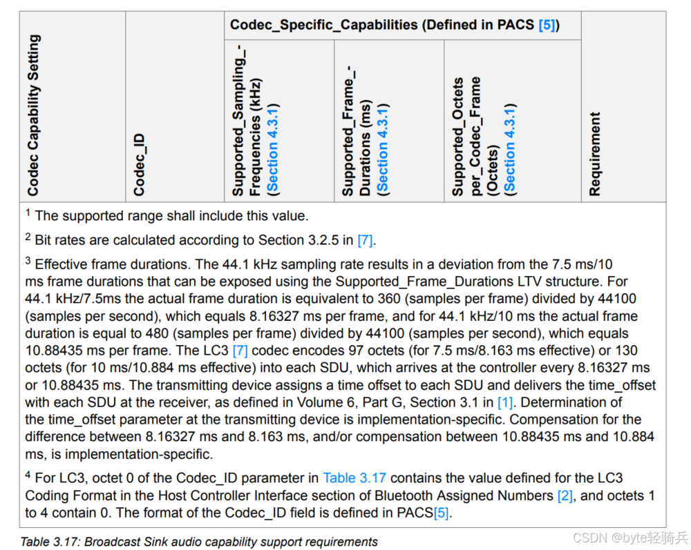 协议要求Broadcast Sink必须支持两组LC3配置,这是跨厂商兼容的准入门槛: