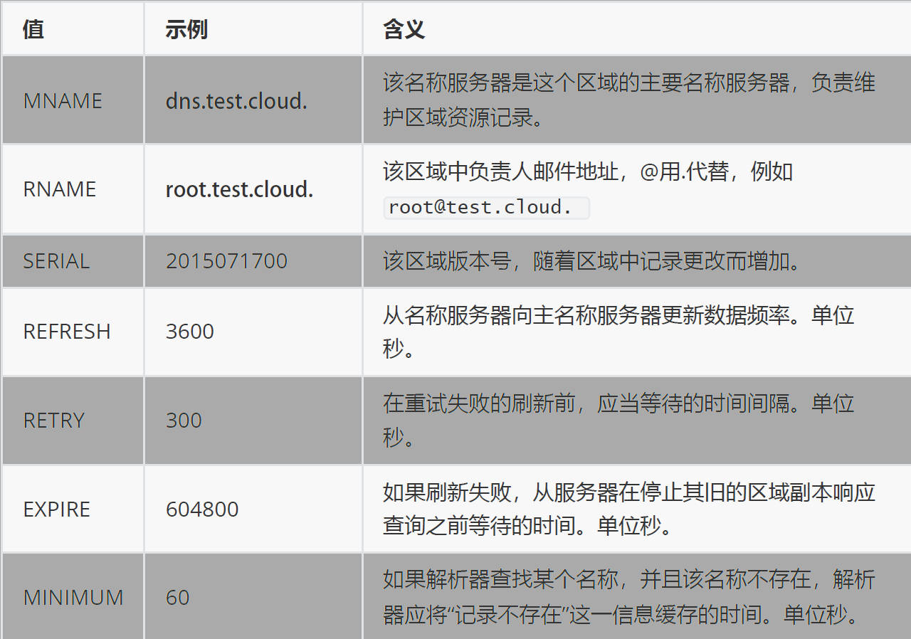 指定其他权威性名称服务器用来确定何时从主要名称服务器传输区域资源记录的各种超时时间。