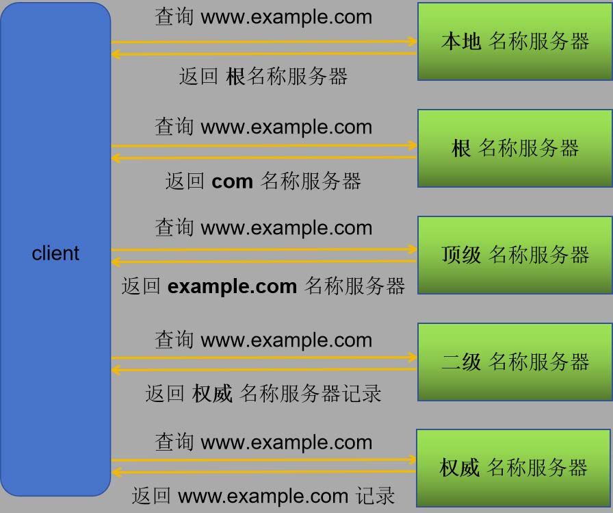 - 本地名称服务器收到 DNS 请求后,先查询本地的缓存,查到存在该域名记录项立即返回结果,否则本地名称服务器不断向 DNS 名称服务器发送 DNS 请求查询,直到查到改域名对应的权威名称服务器并获得记录结果。