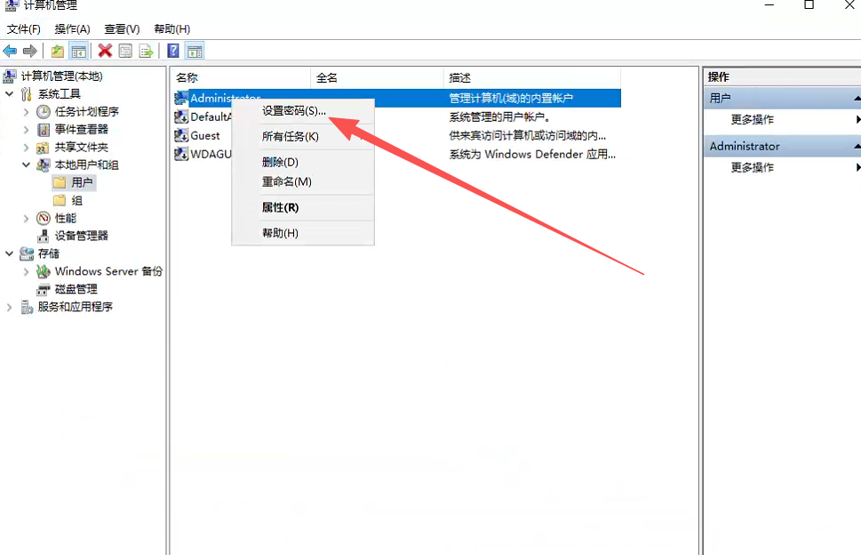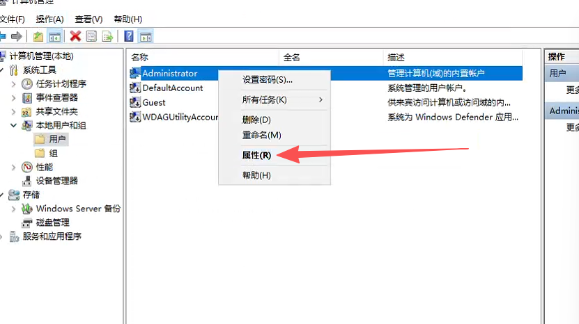 点击左侧的《本地用户与组》、右键点击右侧的Administrator