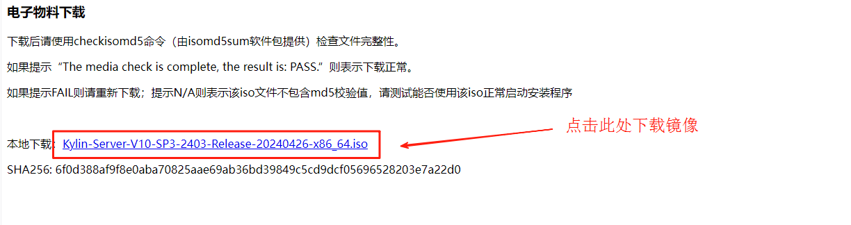 下图就是下载镜像链接,点击”Kylin-Server-V10-SP3-2403-Release-20240426-x86_64.iso”进行下载。