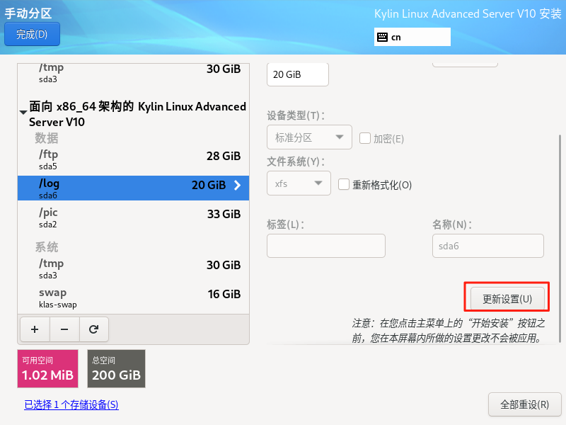 在“全新Kylin Linux Advanced Server V10安装”会有现在要安装的所有的发你去。 在“面向x86_64架构的Kylin Linux Advanced Server V10”里面会显示没有格式化分区的显示。