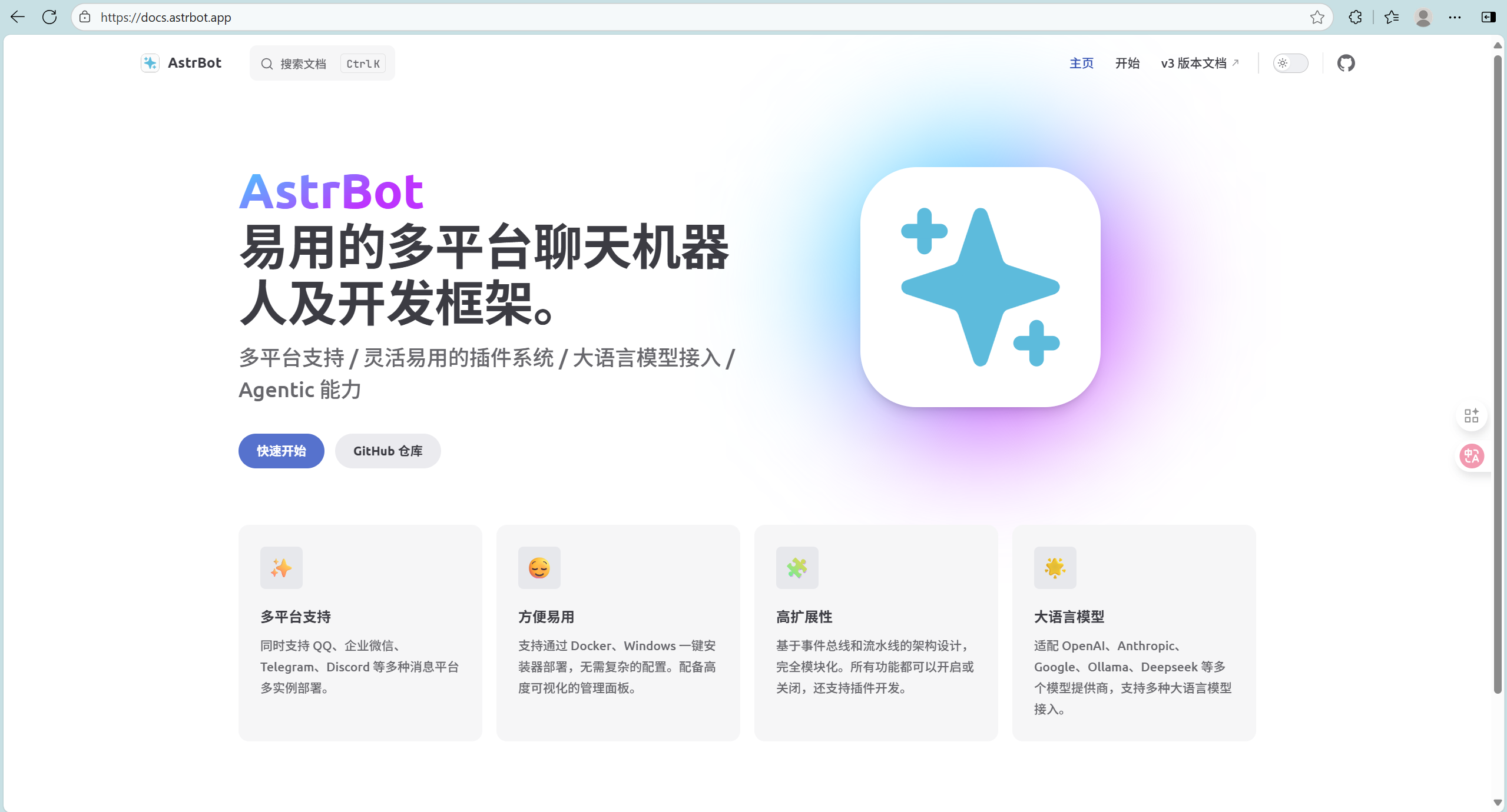 AstrBot 致力于成为一个开源的一站式 Agentic 聊天机器人平台及开发框架。通过它,你能够在多种消息平台上部署和开发一个支持大语言模型(LLM)的聊天机器人。