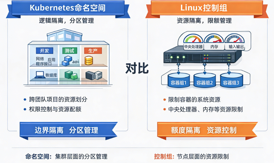Namespace 是把业务和团队“分开管”的逻辑隔离;而 cgroup 是 Linux 在节点上把 CPU、内存这些“卡住限量”的资源隔离,一个管