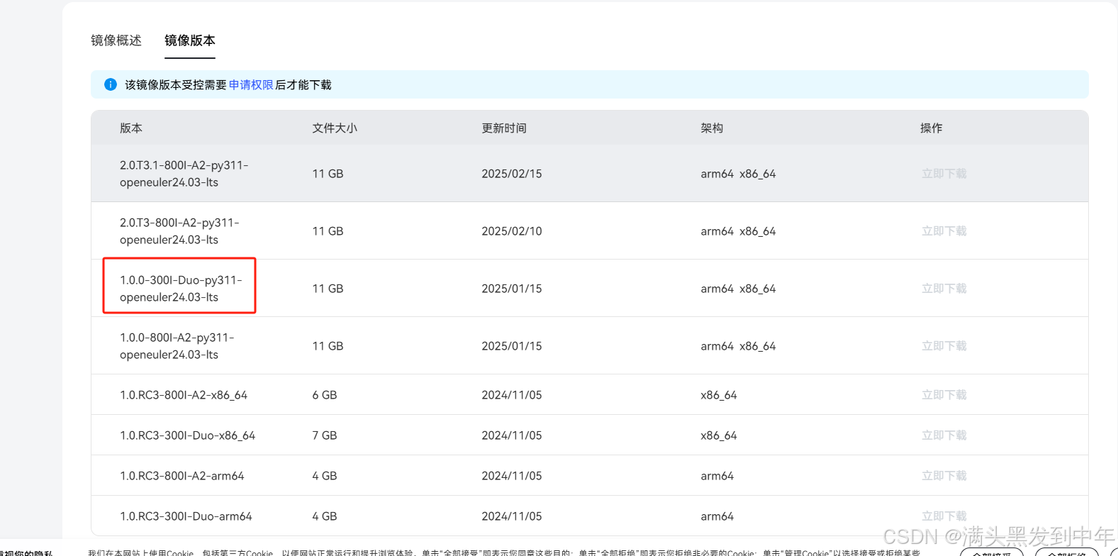 前提条件:服务器已安装docker 1.下载镜像: 1.0.0-300I-Duo-py311-openeuler24.03-lts 备注:官网镜像下载,需要申请,审批